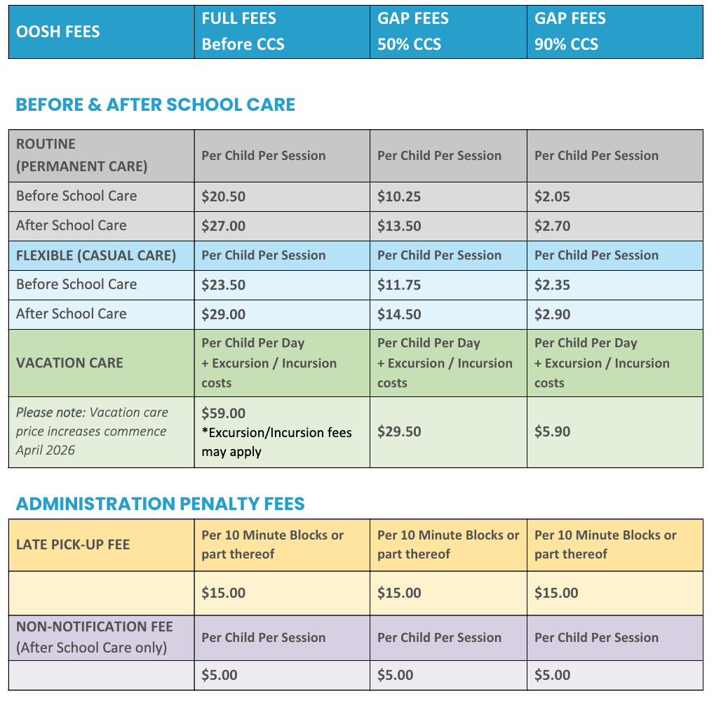 Vacation Care: 7:00am - 6:30pm (please refer to our Vacation Care page for more details)